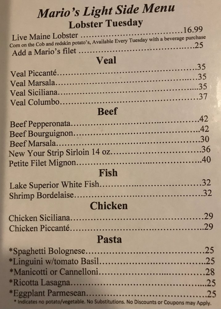 Welcome to Mario's Restaurant, a charming Italian eatery located in Detroit, Michigan. This establishment offers a wide range of amenities including reservation options, delivery, takeout, and catering services. The menu features delicious hot appetizers such as Italian sausage, garlic toast, and calamari, as well as chilled options like shrimp cocktail and marinated mushrooms. In addition, patrons can enjoy a variety of soups including minestrone and Fruitti de Mare. With a full bar, happy hour specials, and options for outdoor seating, Mario's Restaurant is the perfect spot for a casual meal or special occasion. Whether you're a pescatarian, vegetarian, or meat lover, there is something for everyone at Mario's. Don't miss out on the opportunity to indulge in the flavors of Italy at this delightful restaurant.